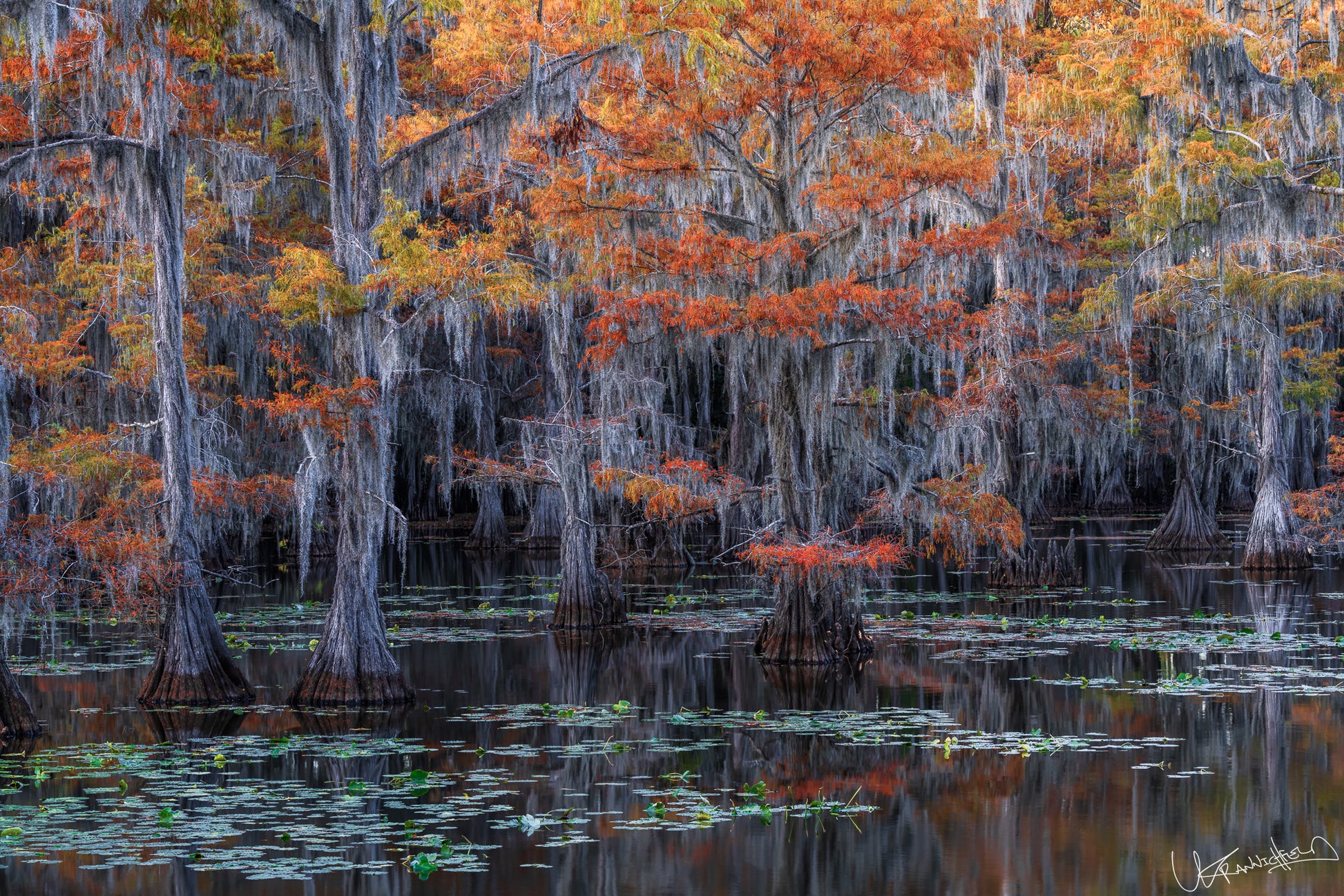 Hard to beat this amazing scene, it's got it all! Fall color, epic moss covered cypress trees and a higher vantage point that allows the floating greenery to become a nice foreground element. I found my eye following the trails along the surface of the water as I was shooting, and still see that here in the final image.